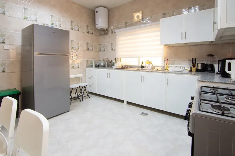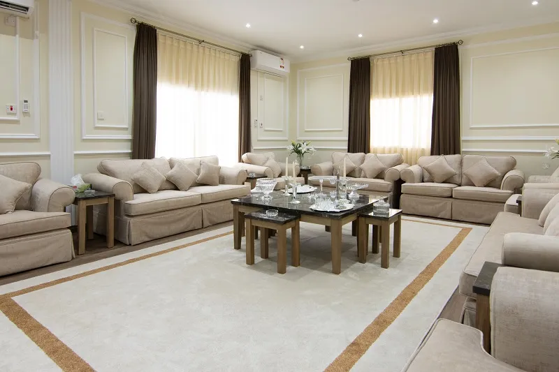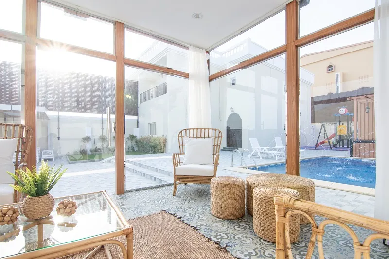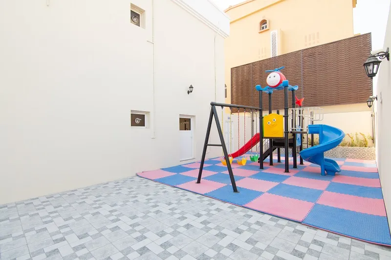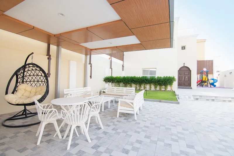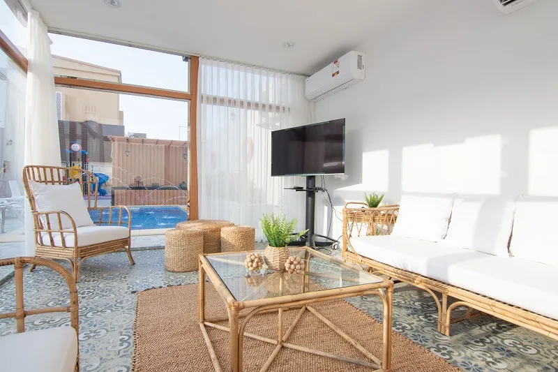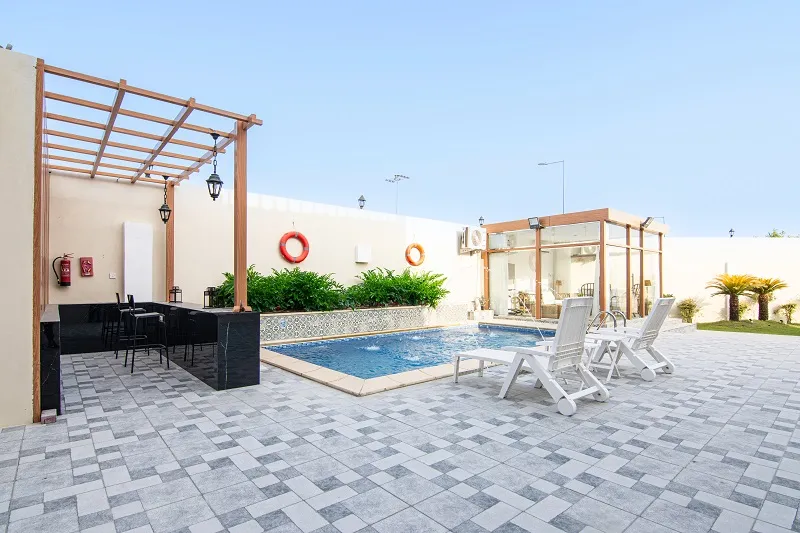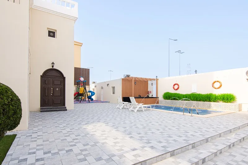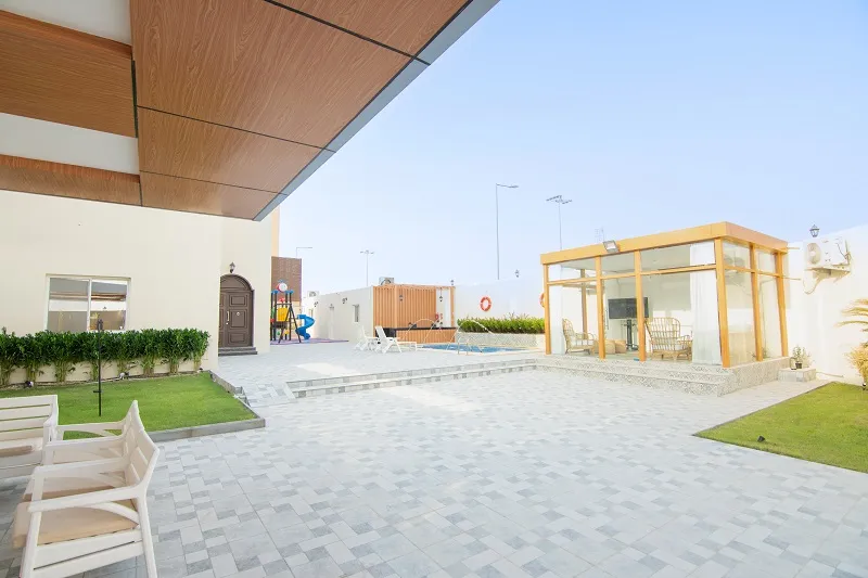 Al Gharrafa Resort located in the heart of Doha offers a luxurious amenities for relaxation and leisure. It has a private pool, an expansive outdoor seating area, and an outdoor majlis for traditional Arabian-style relaxation.