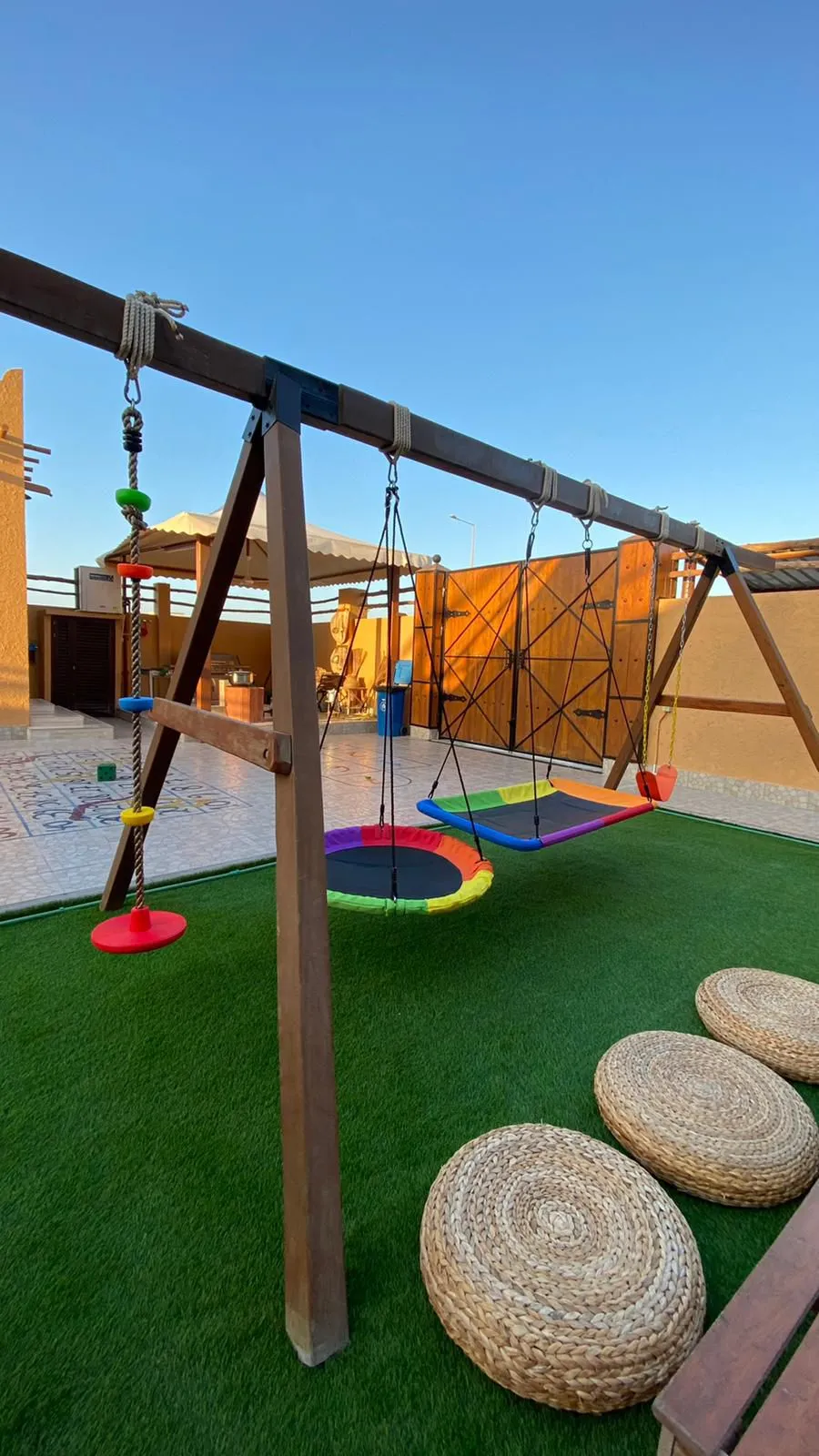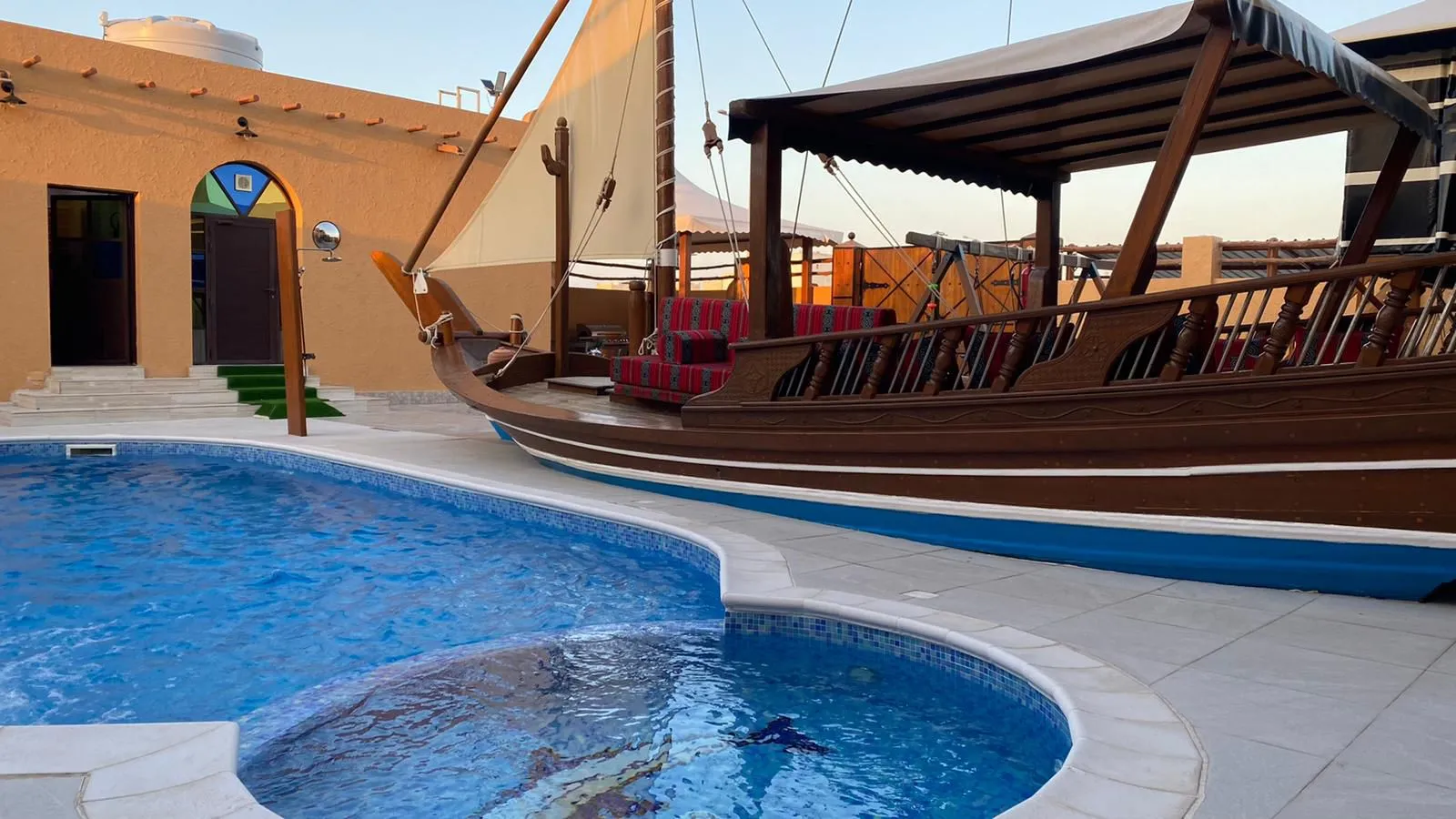 The villa consists of 4 bedrooms with 8 beds and 6 bathrooms, of course fully equipped kitchen. We don't forget the heated swimming pool with jacuzzi and bubbles which is suitable for kids and adults, the outdoor sitting area is found in a dhow with kids playing area and BBQ.