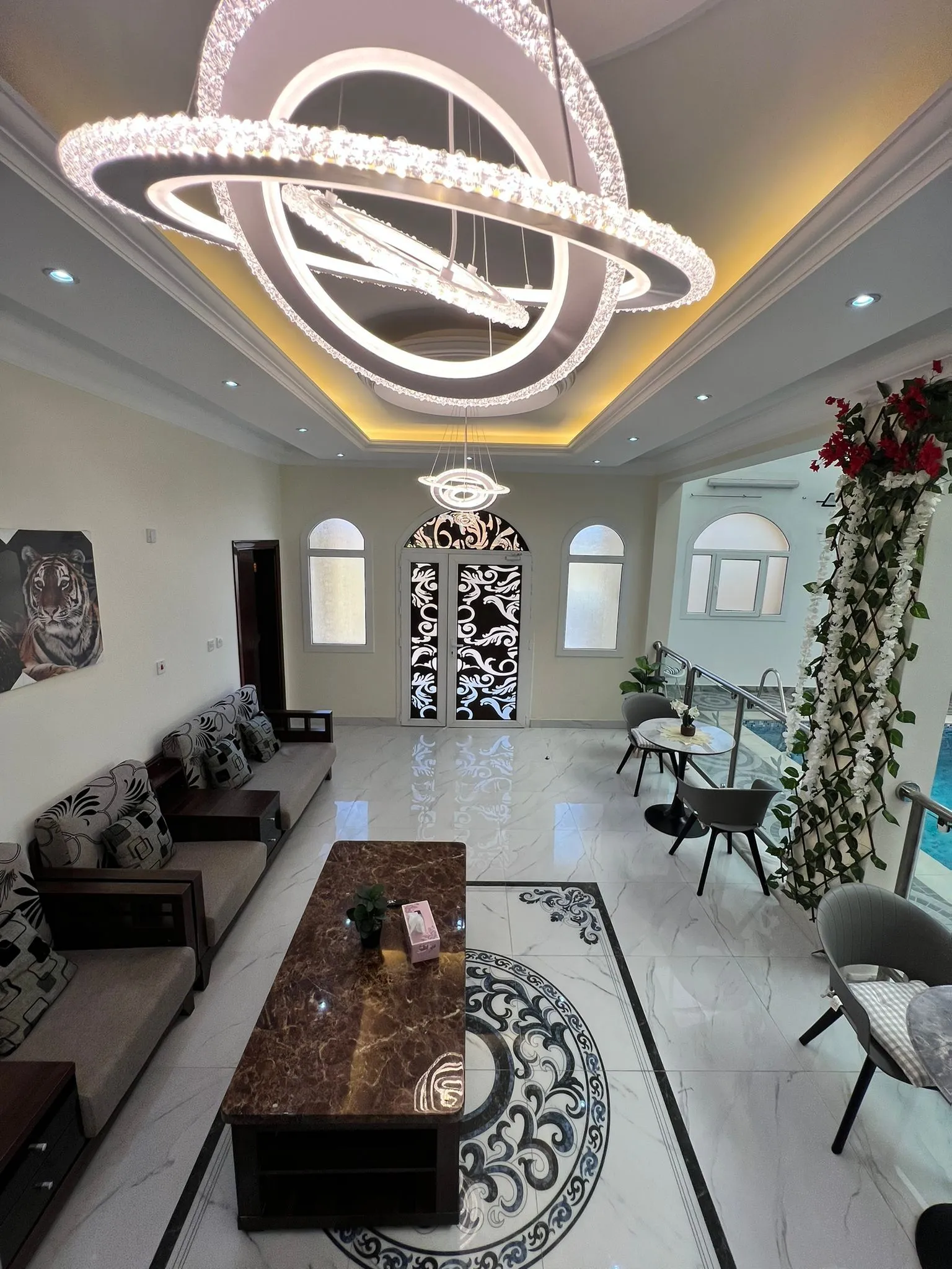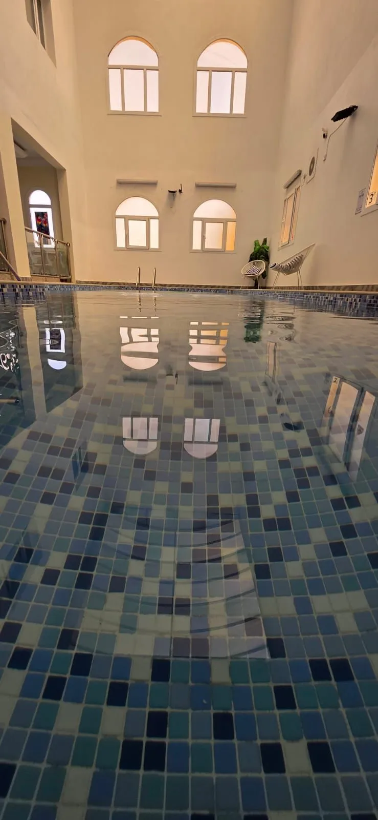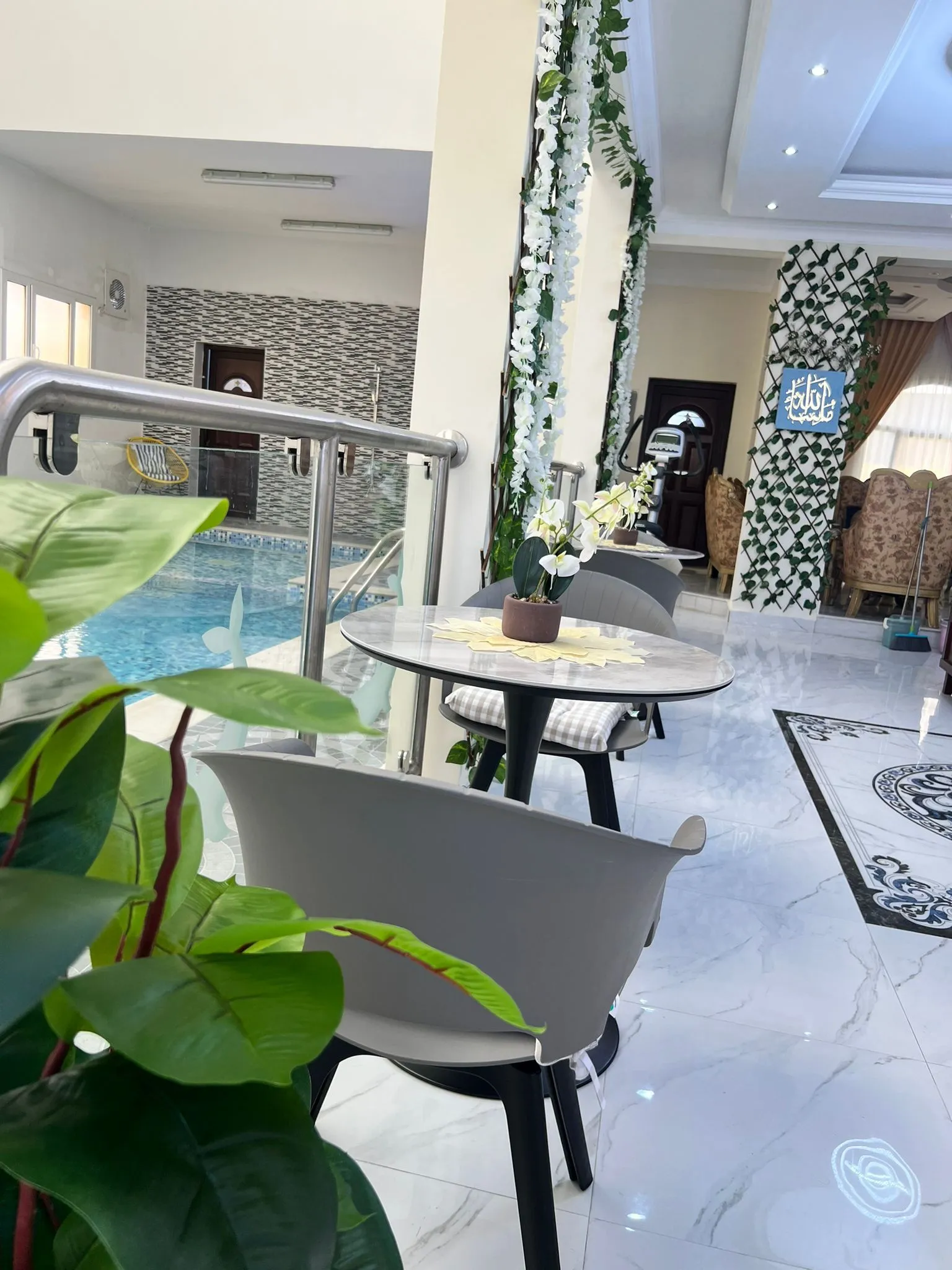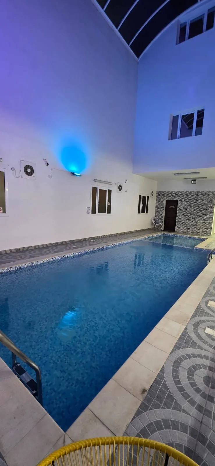 A cosy rest house located in al-sakhama, a perfect place to escape from the city noises, the villa consists of 4 bedrooms 2 of them master, 5 bathrooms and an indoor swimming pool, also there is a winter outdoor seating area with a glass facade with a garden and kids playing area.