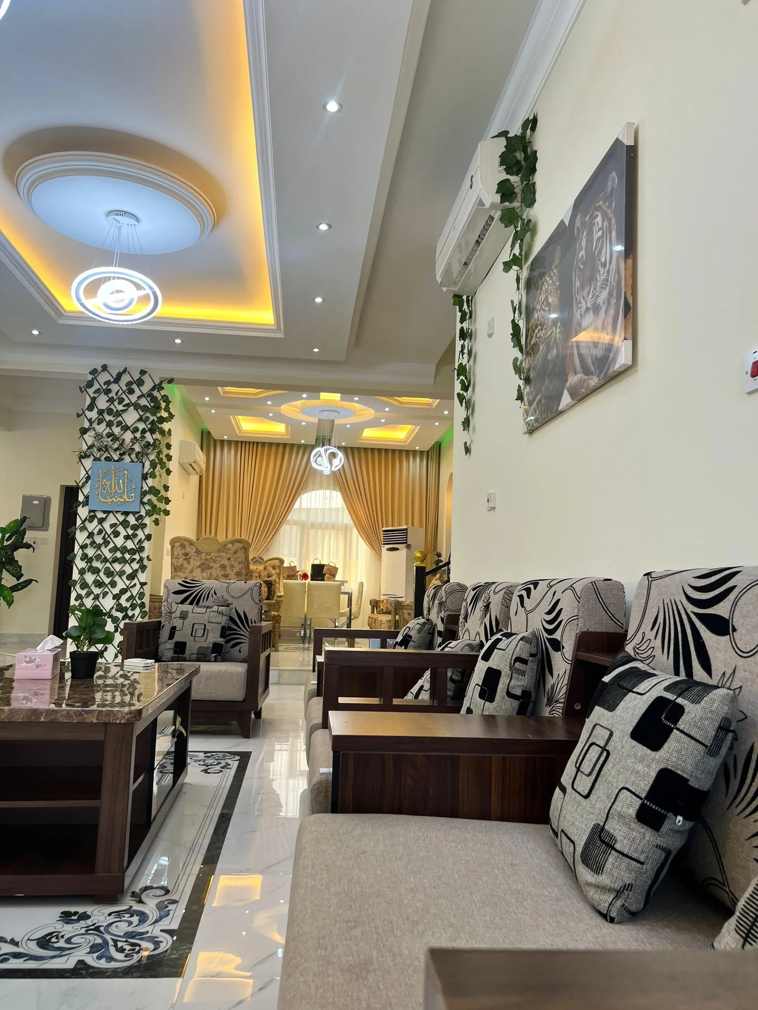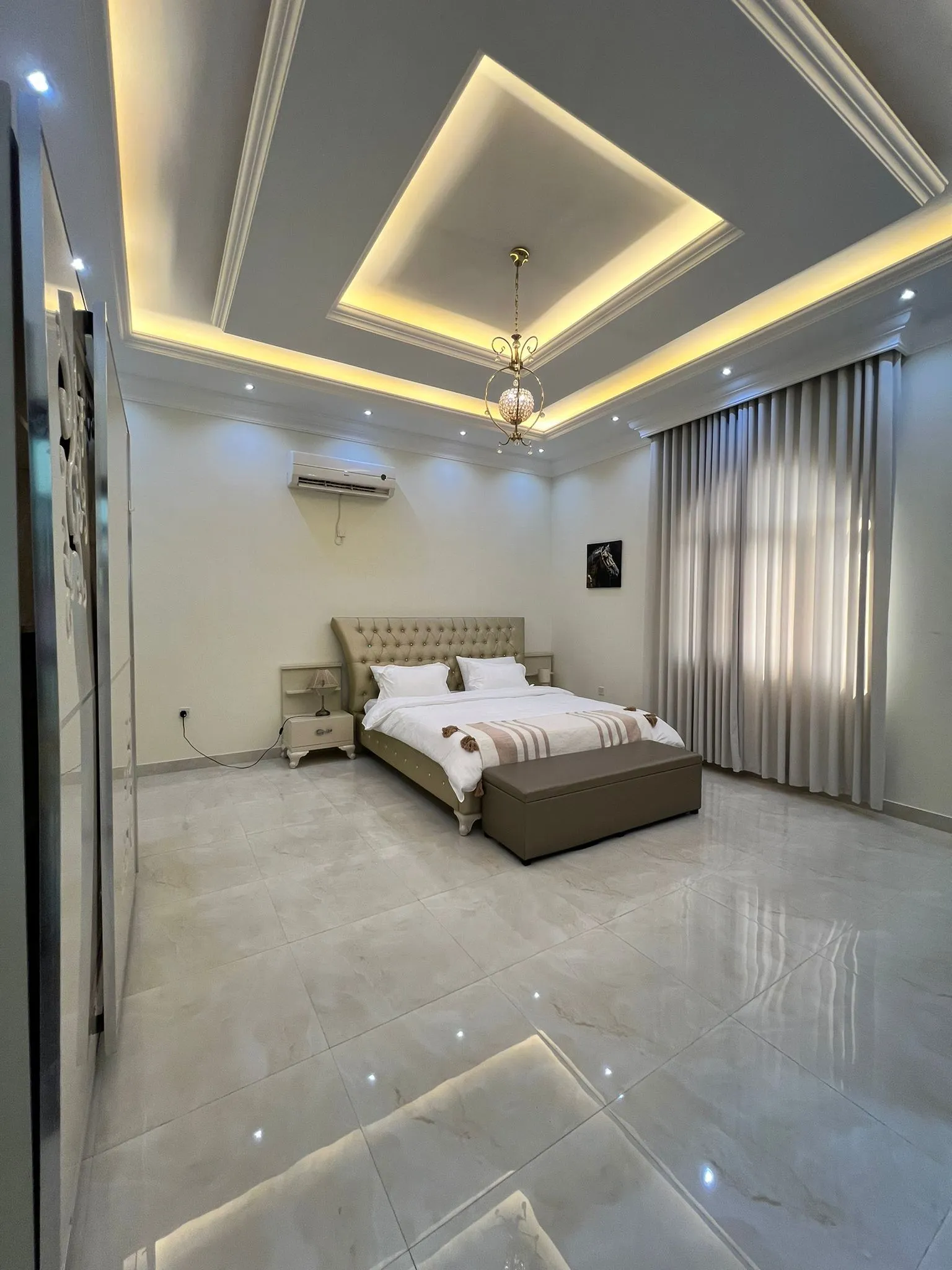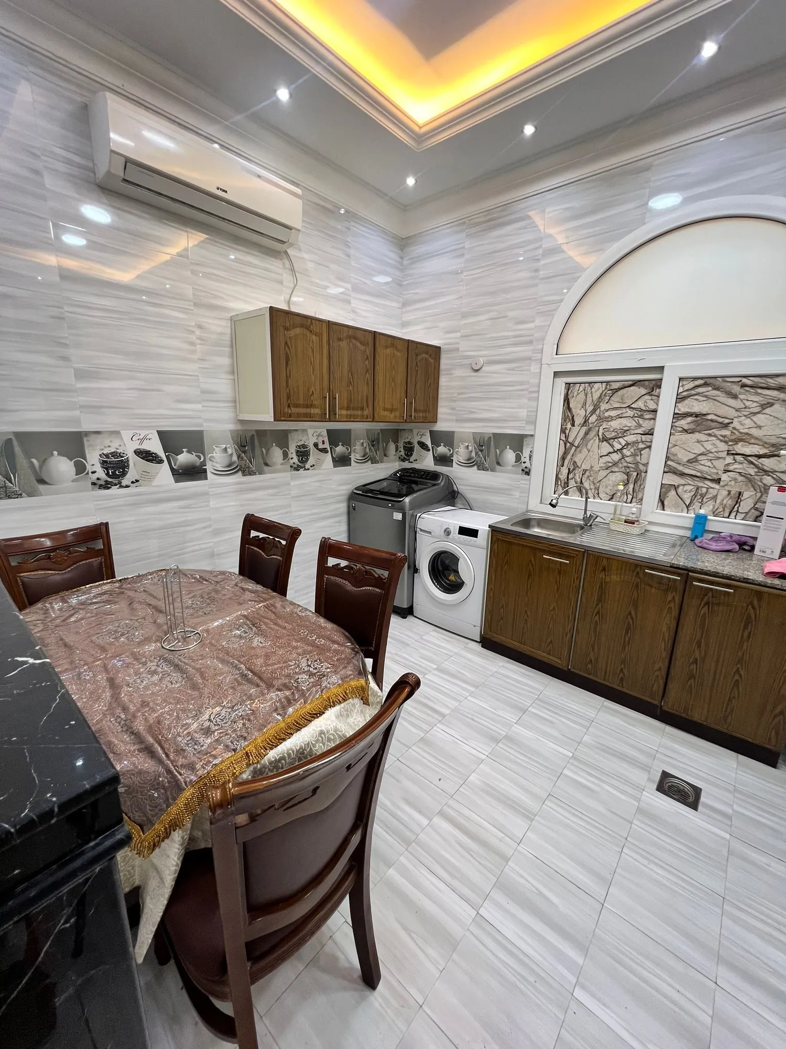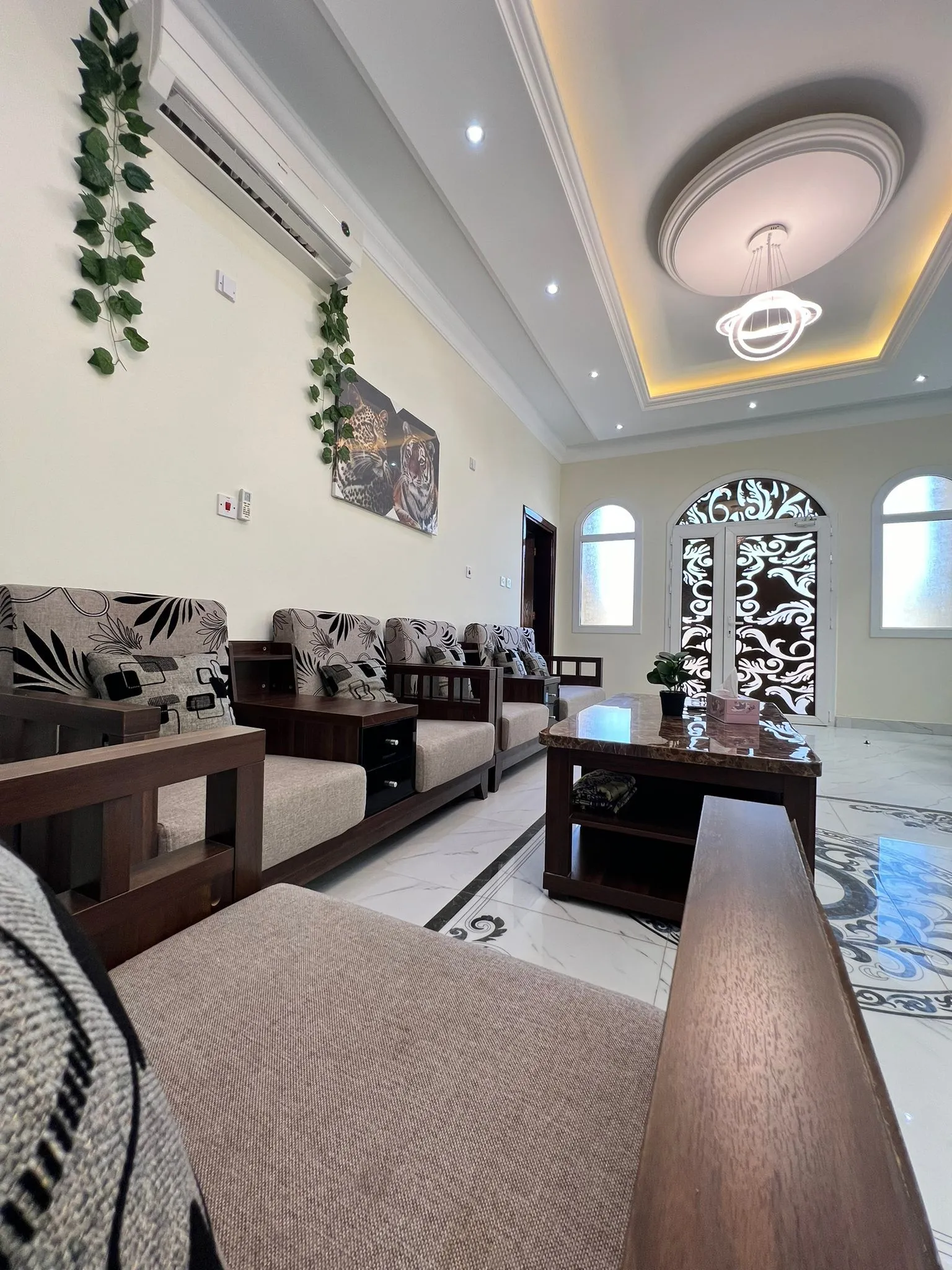 A cosy rest house located in al-sakhama, a perfect place to escape from the city noises, the villa consists of 4 bedrooms 2 of them master, 5 bathrooms and an indoor swimming pool, also there is a winter outdoor seating area with a glass facade with a garden and kids playing area.