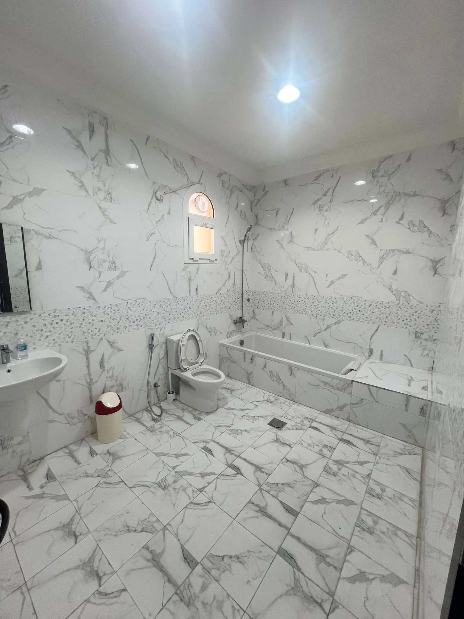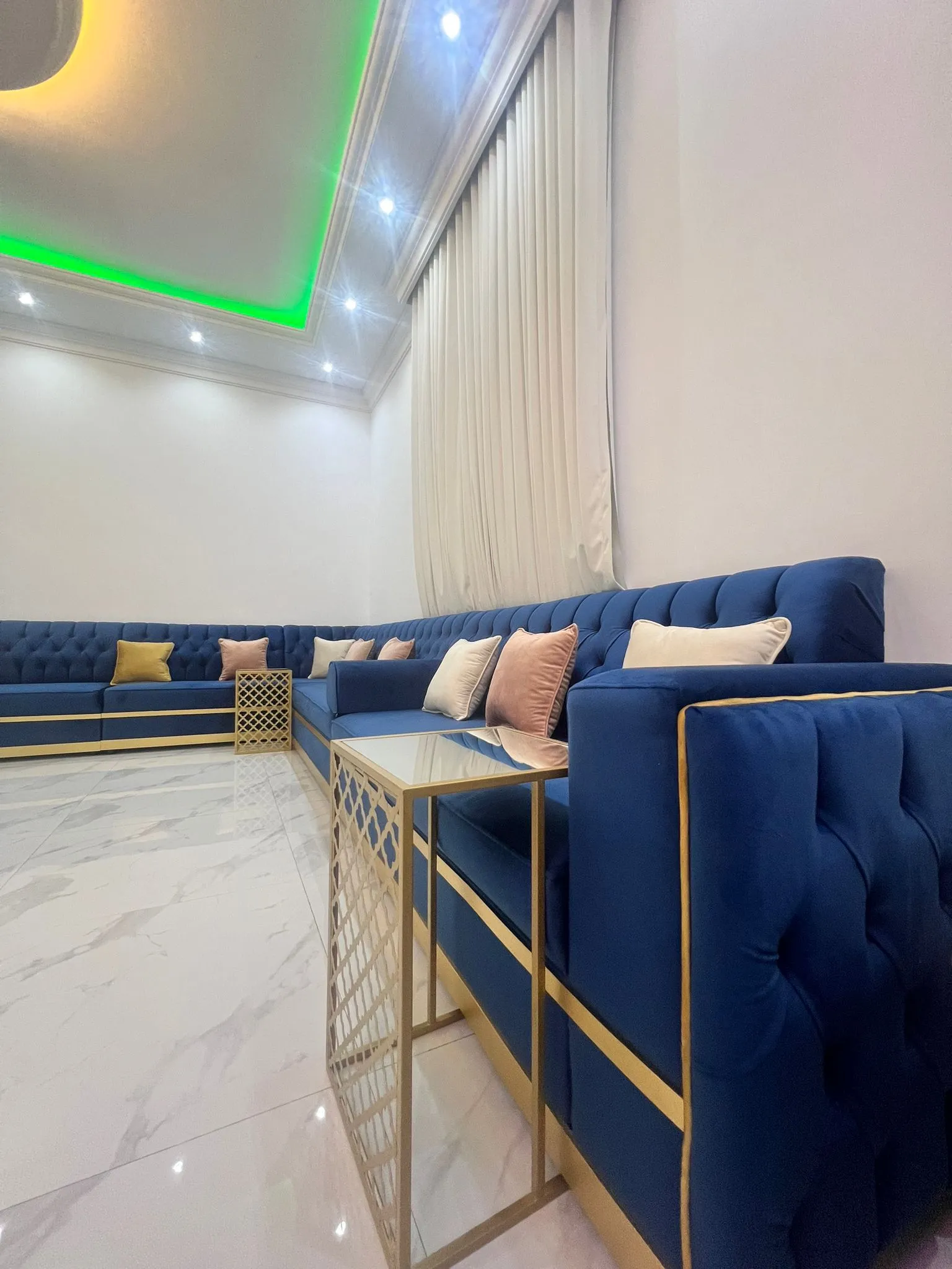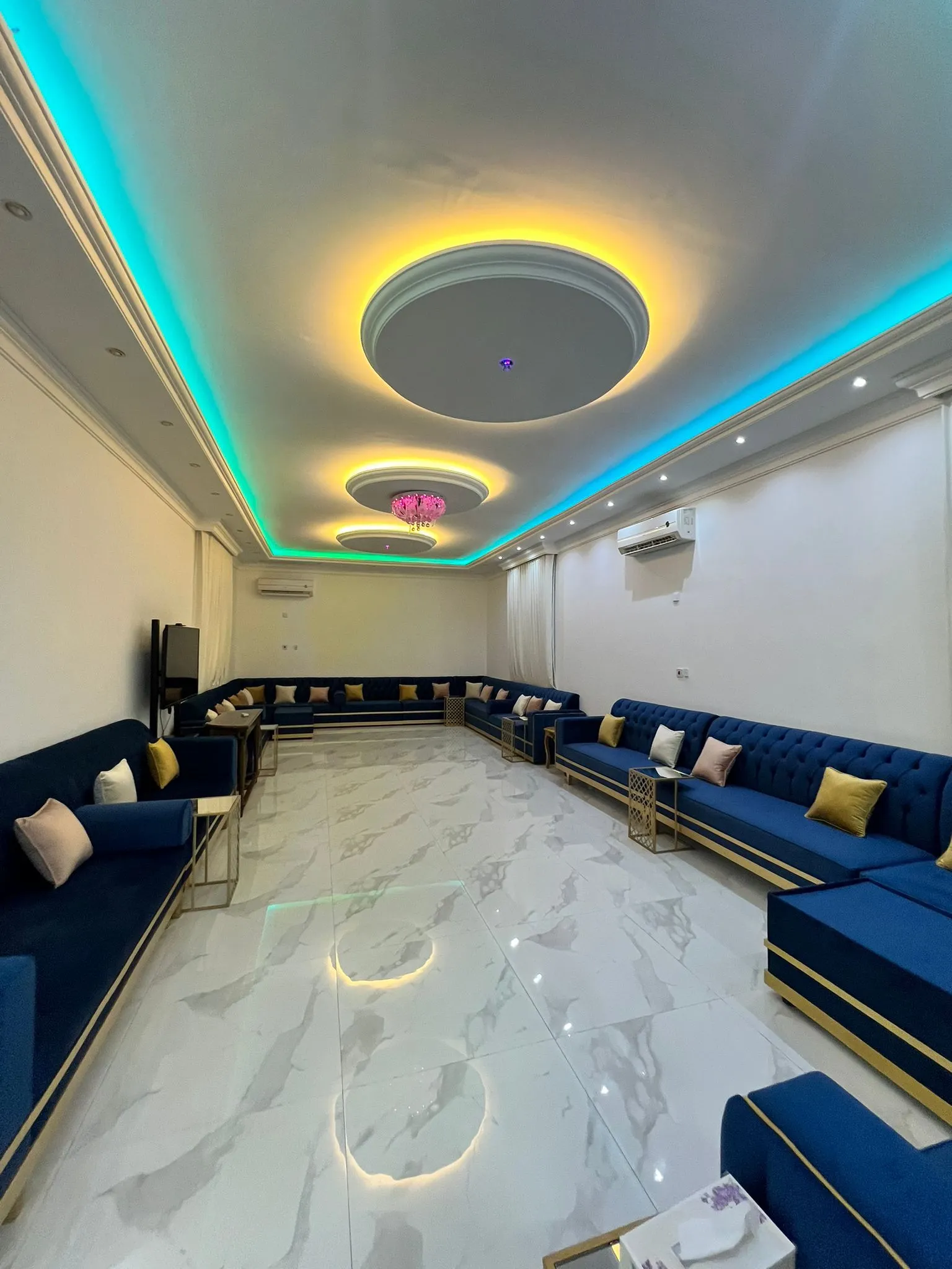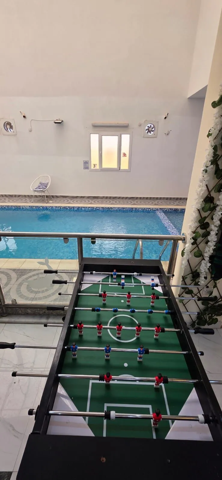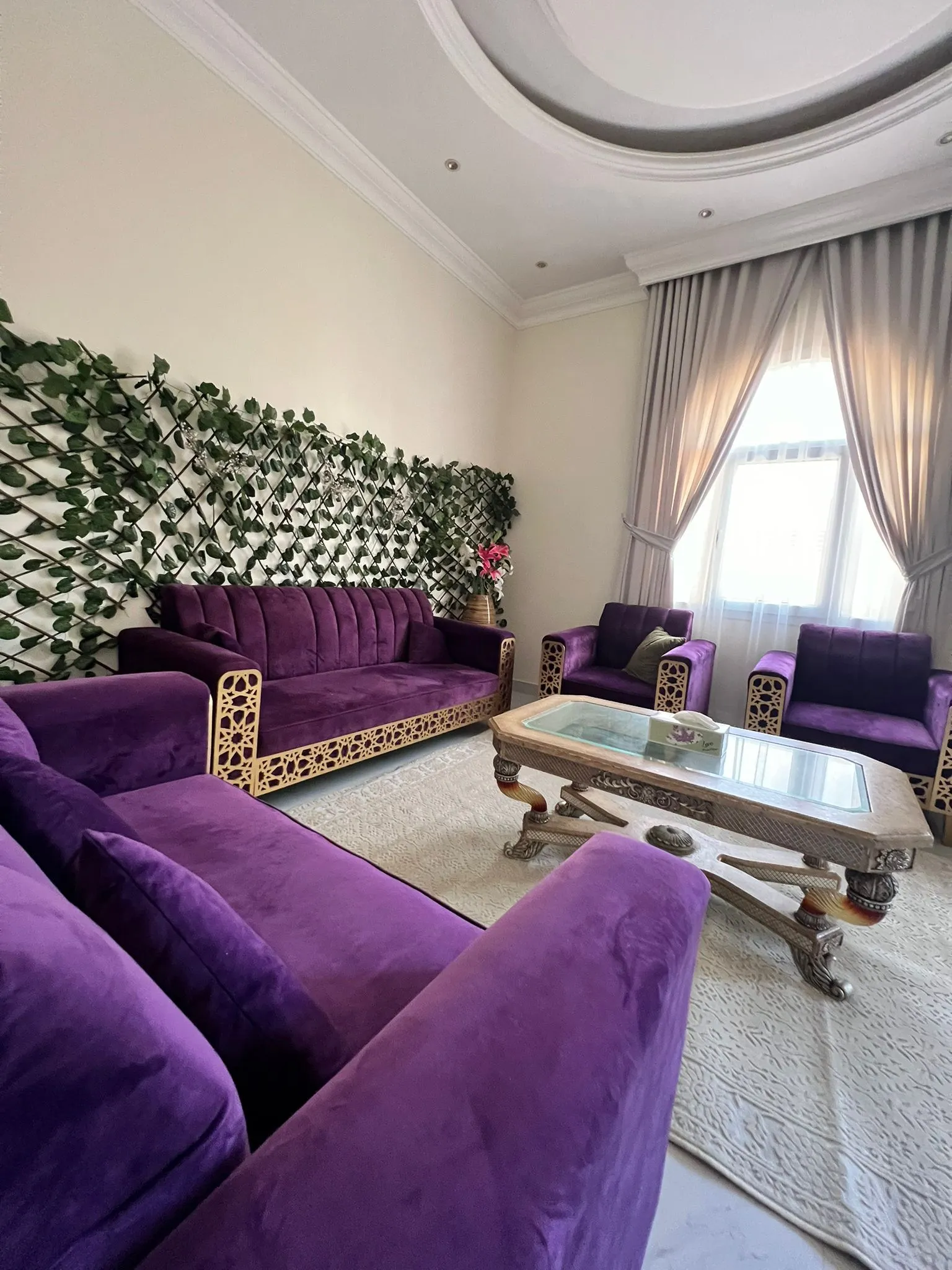 A cosy rest house located in al-sakhama, a perfect place to escape from the city noises, the villa consists of 4 bedrooms 2 of them master, 5 bathrooms and an indoor swimming pool, also there is a winter outdoor seating area with a glass facade with a garden and kids playing area.