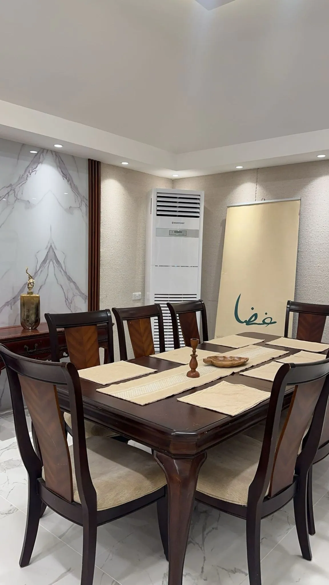 1 living room with a dining table for 8 people, floor seating, and air conditioning throughout.