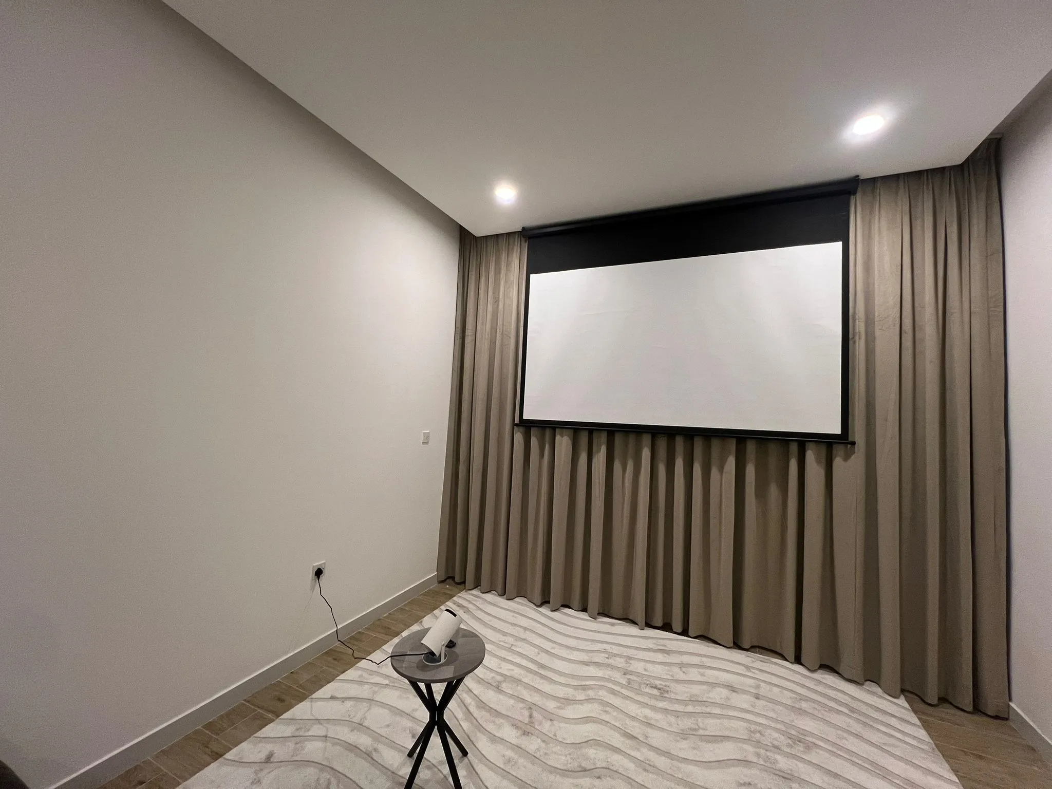 The layout includes 2 master bedrooms with private bathroom, living area with full pool view, a fully equipped kitchen, dining table, kids playing room and a private cinema room.